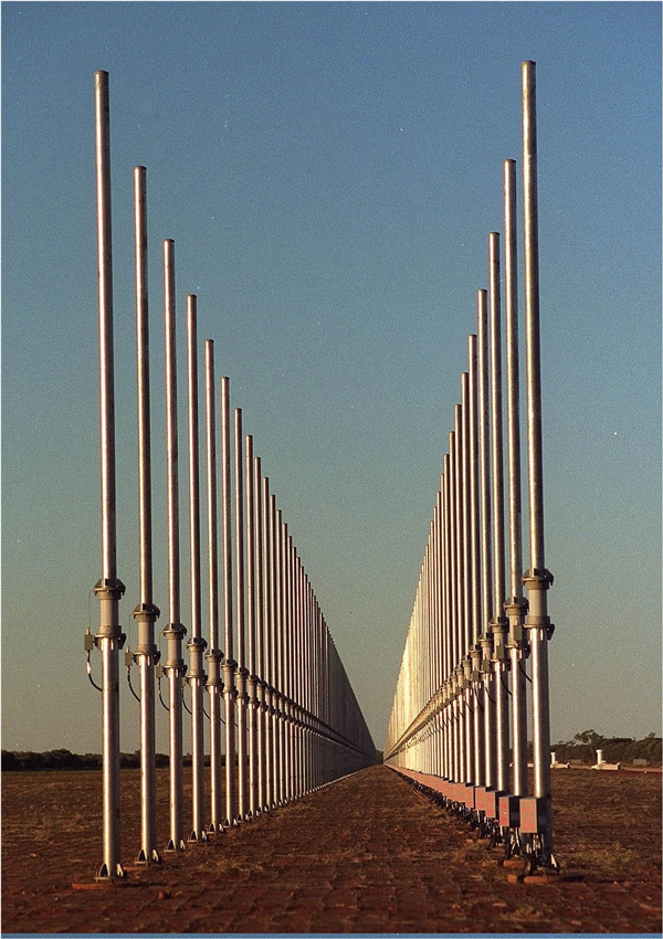 One end of the 3.2km arrays of dipole antennae at the JORN Longreach receiver.